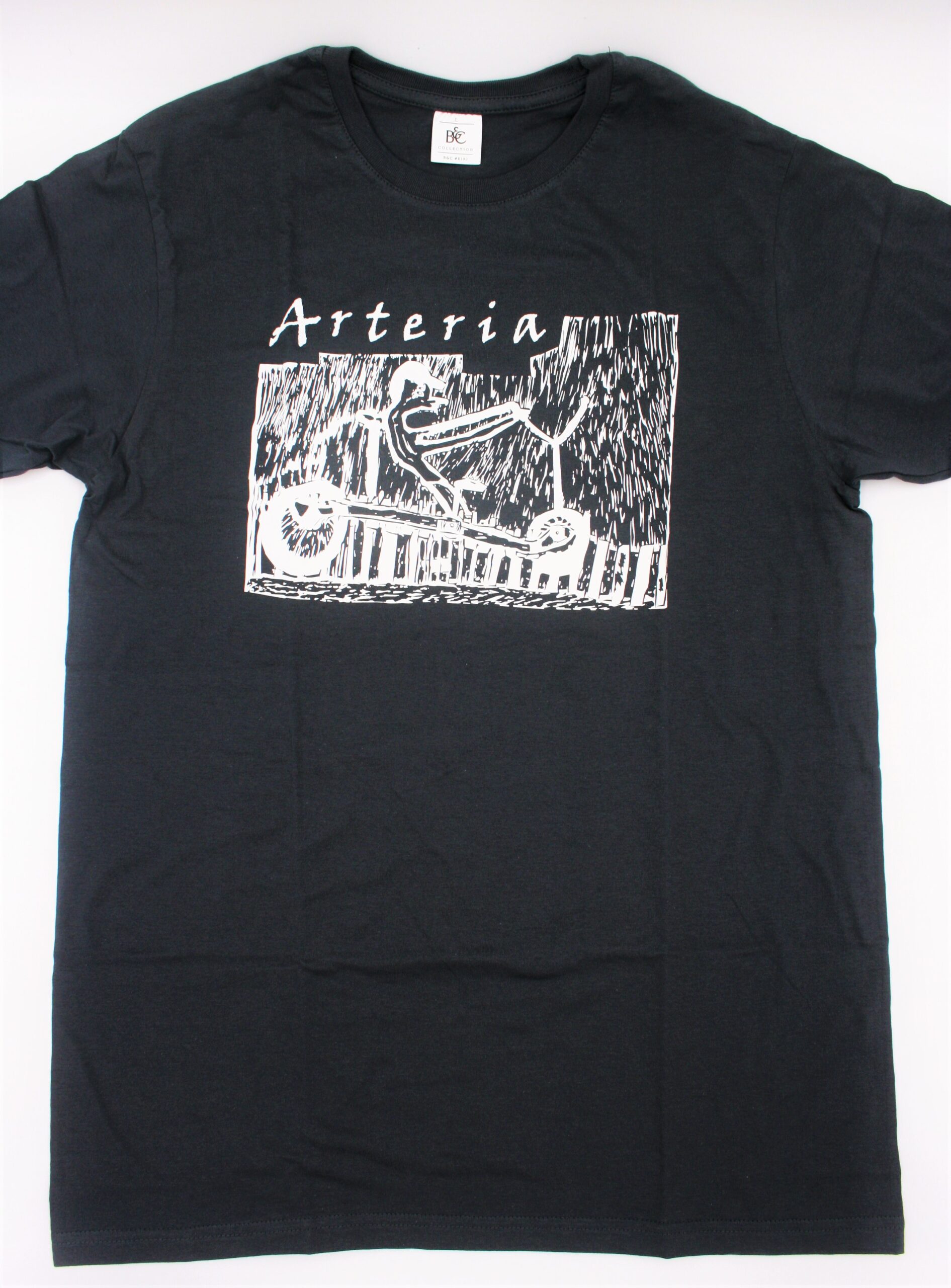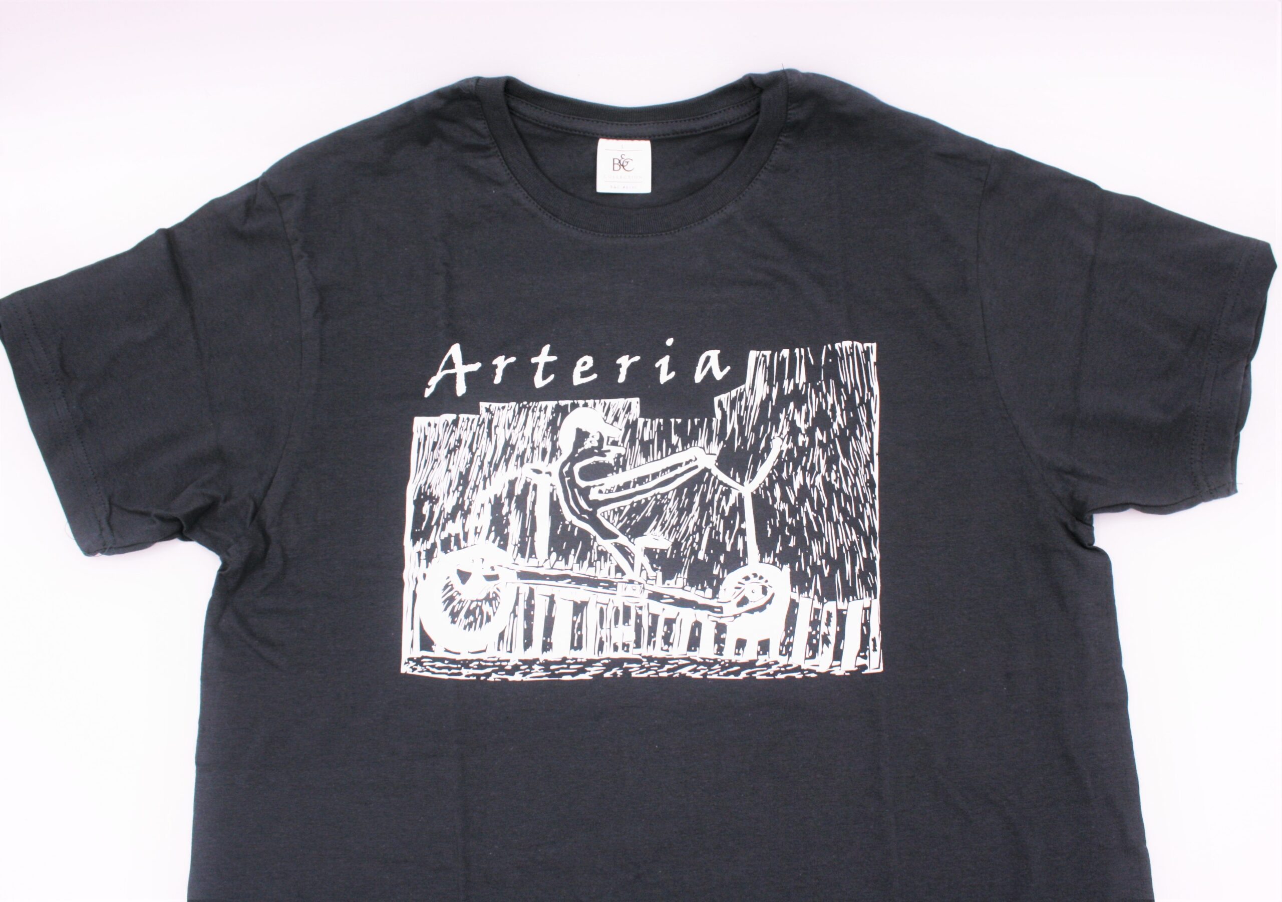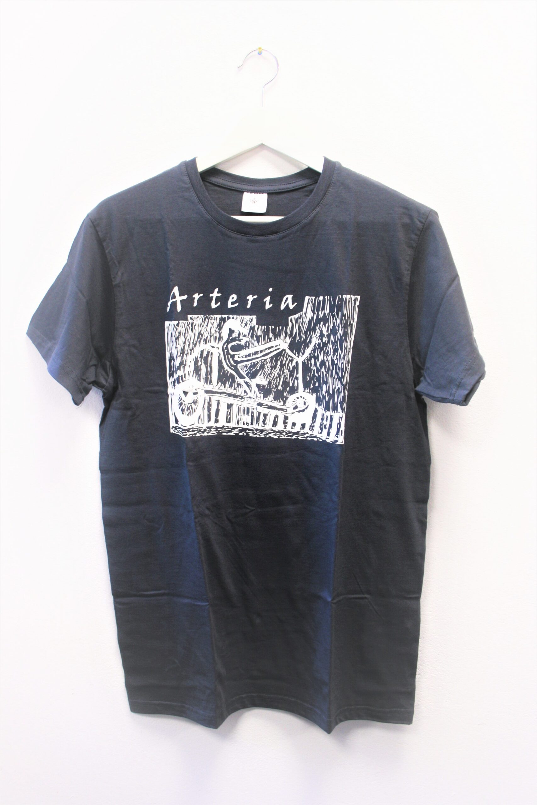 Wyjątkowa koszulka w kolorze szarym z nadrukiem pracy wykonanej w technice linorytu. Praca pt. Odjazd wykonana przez uczestniczkę Warsztatu Terapii Zajęciowej Ewelinę Augustyniak.